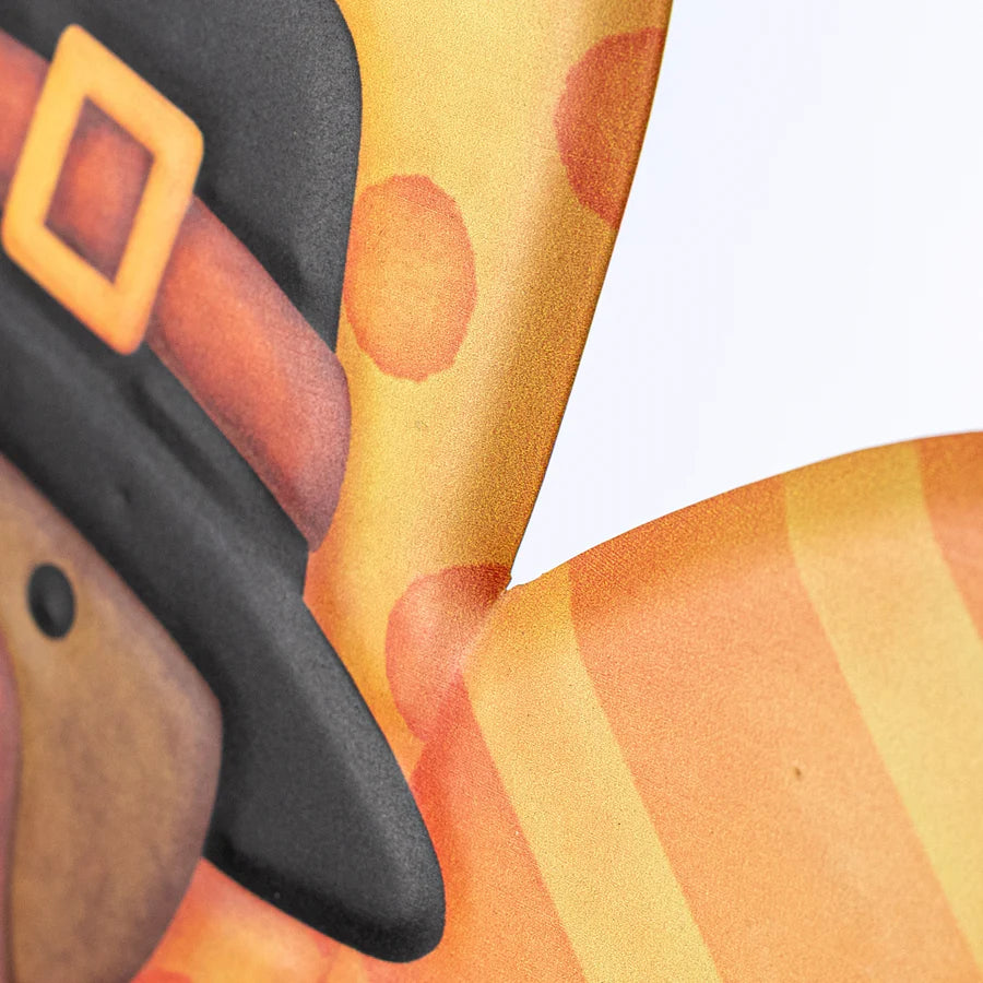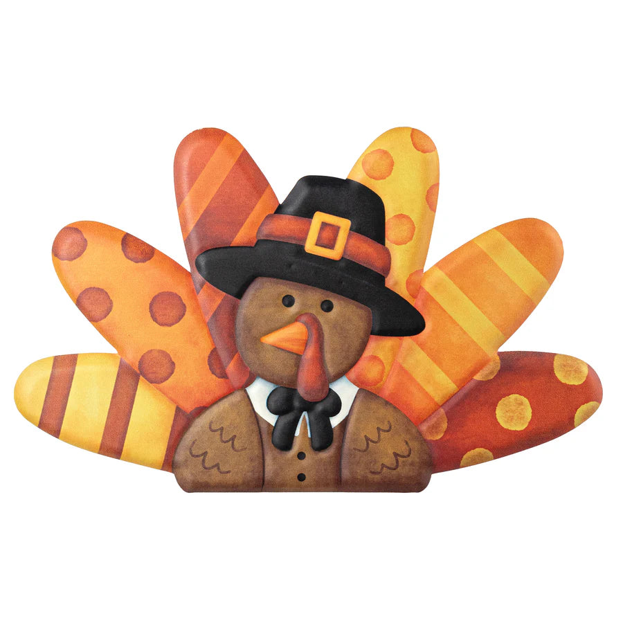 This embossed metal decoration features a festive Thanksgiving turkey wearing a traditional Pilgrim hat with an orange band and square buckle. The embossed construction creates dimensional depth while keeping the piece lightweight and weather-resistant for both indoor and outdoor seasonal displays.