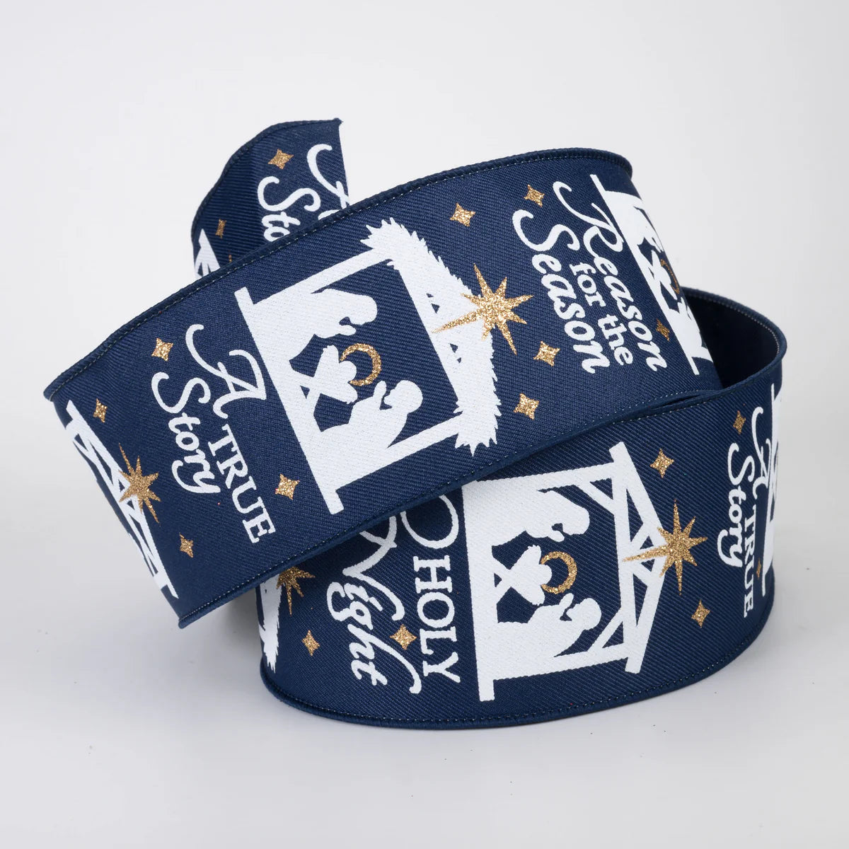 The silhouette of a nativity scene is printed on this navy blue canvas ribbon in white. The Star of Bethlehem and baby Jesus' halo sparkle with gold metallic paint. Between each iteration of the creche is one of three phrases: "A true story," "Reason for the season," or "A savior is born."